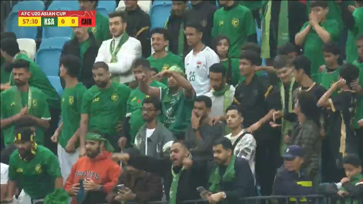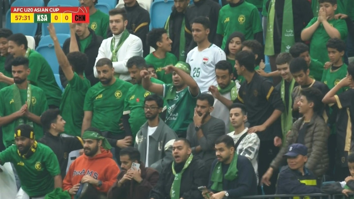 主裁做出判罚后,球门后的沙特球迷非常不满,手比划着示意看VAR。